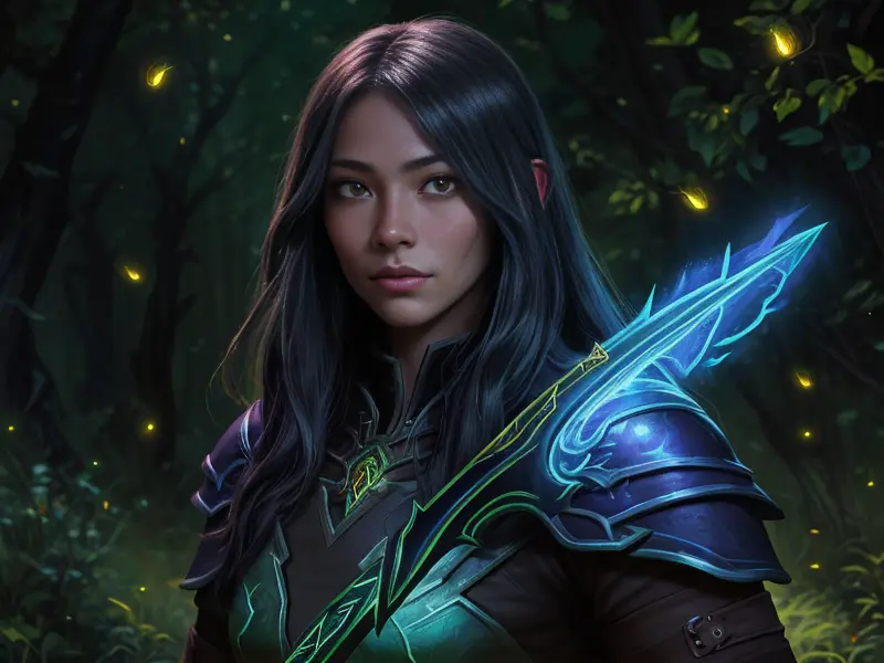 Illustration of Stealthy Human, Spellblade, In an enchanted clearing, surrounded by glowing fireflies, medium shot, heroic fantasy human, realistic human face, natural skin tones, normal human anatomy, Robust, warcraft style, colorful and fun