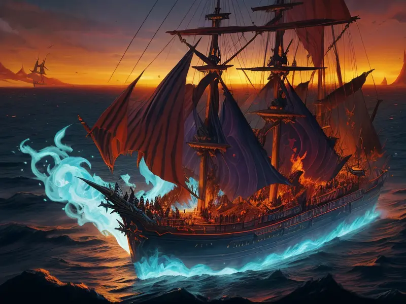 Illustration of Starforged Undead, Pyromancer, On the deck of a ghost ship, sails torn by time, Fragile, warcraft style, colorful and fun