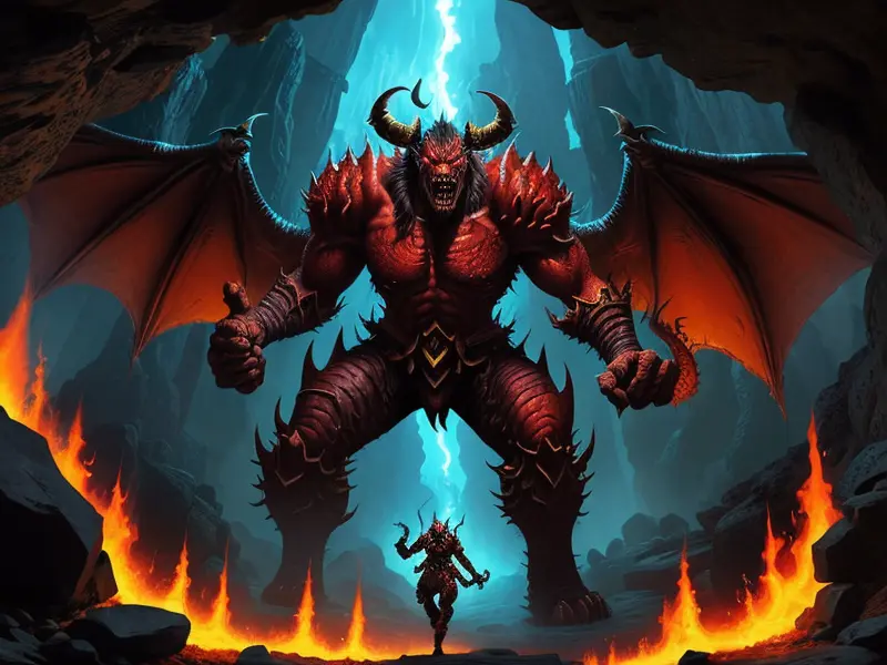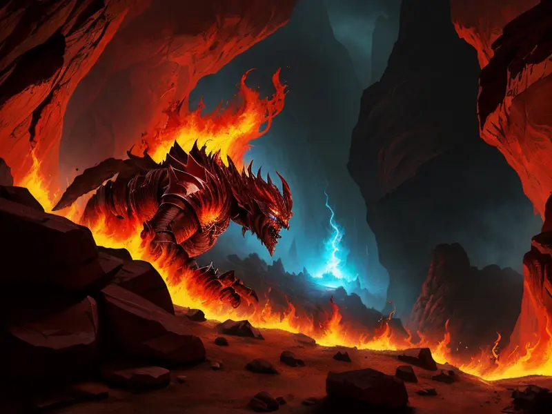Illustration of Fearless Demon, Warrior, At the mouth of a dragon's cave, heat shimmering in the air, shoulder-level shot, Weak, warcraft style, colorful and fun