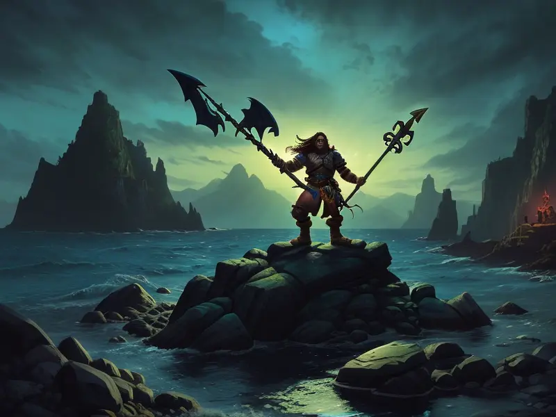Illustration of Heroic Dwarf, Pirate, On a rocky shoreline, holding a trident that gleams in the light, dramatic backlit silhouette, Fragile, warcraft style, colorful and fun