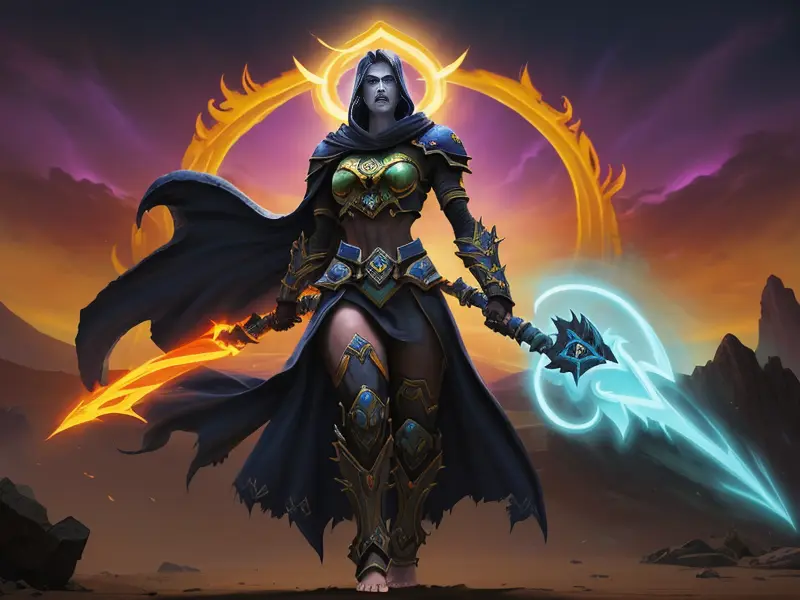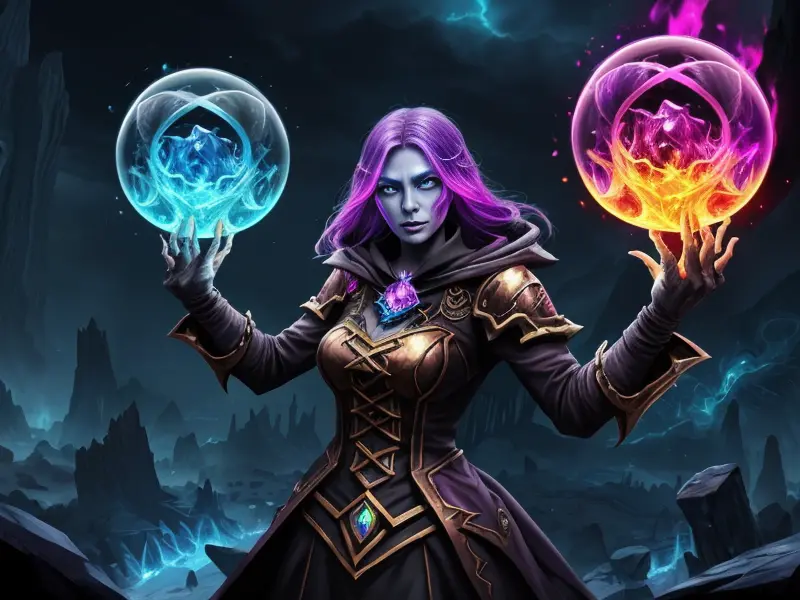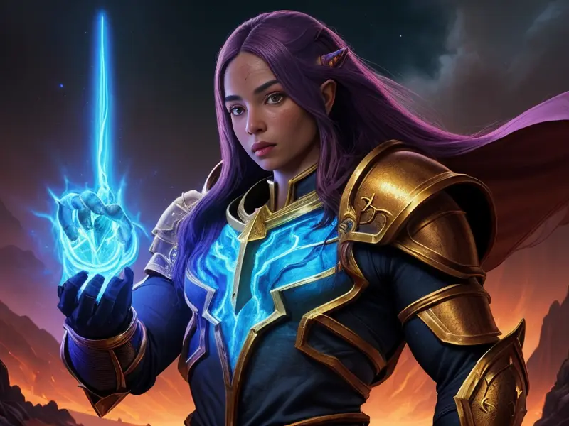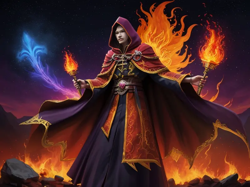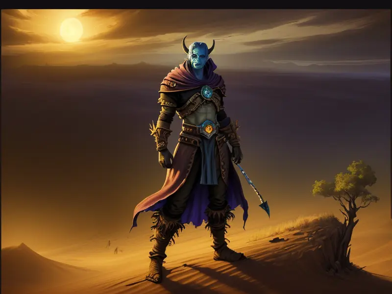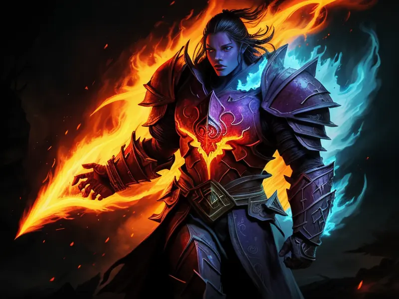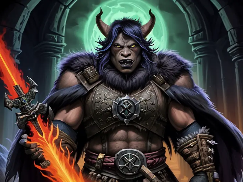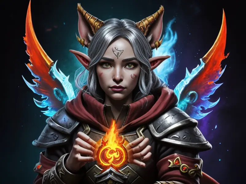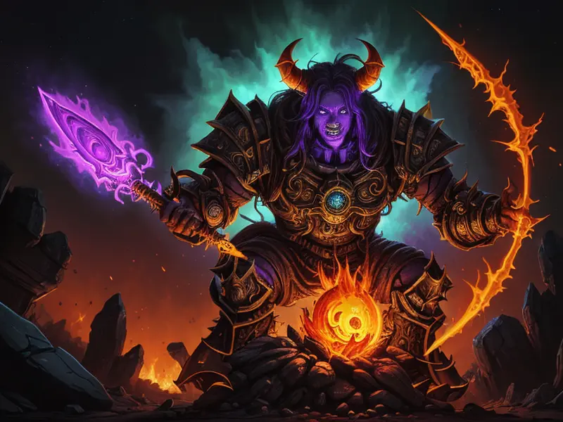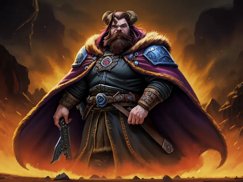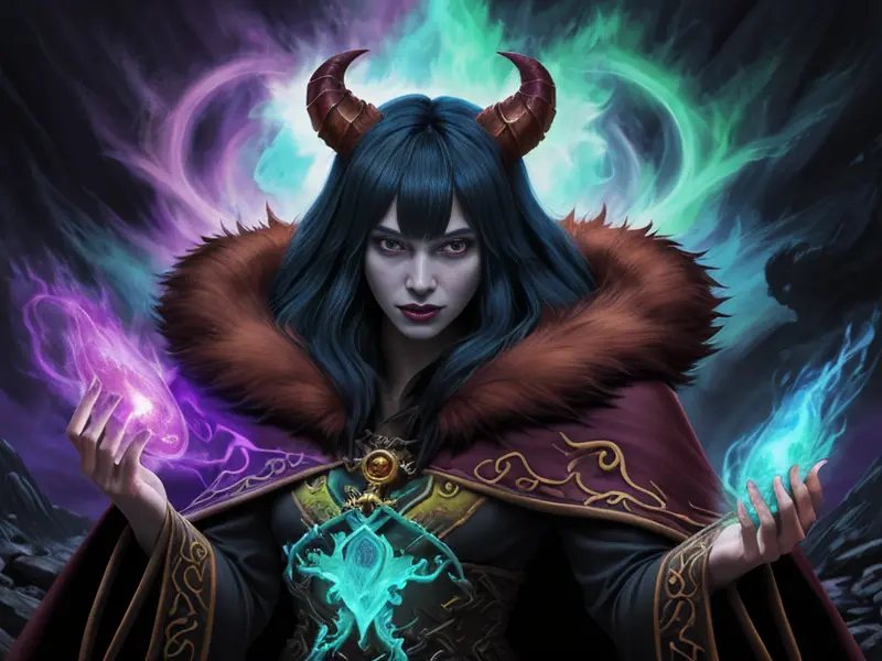 Illustration of Radiant Demon, Elementalist, Wears a cloak made from legendary beast fur, medium close-up, warcraft style, colorful and fun