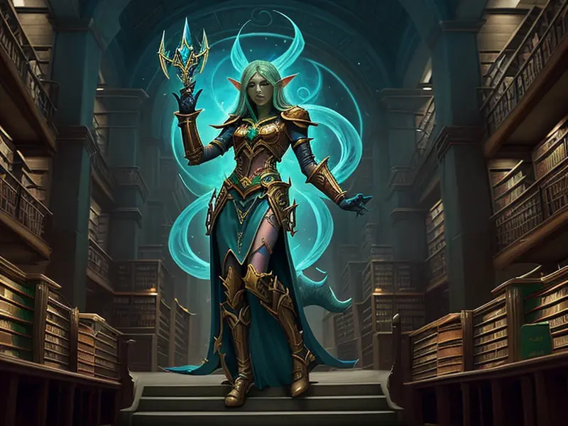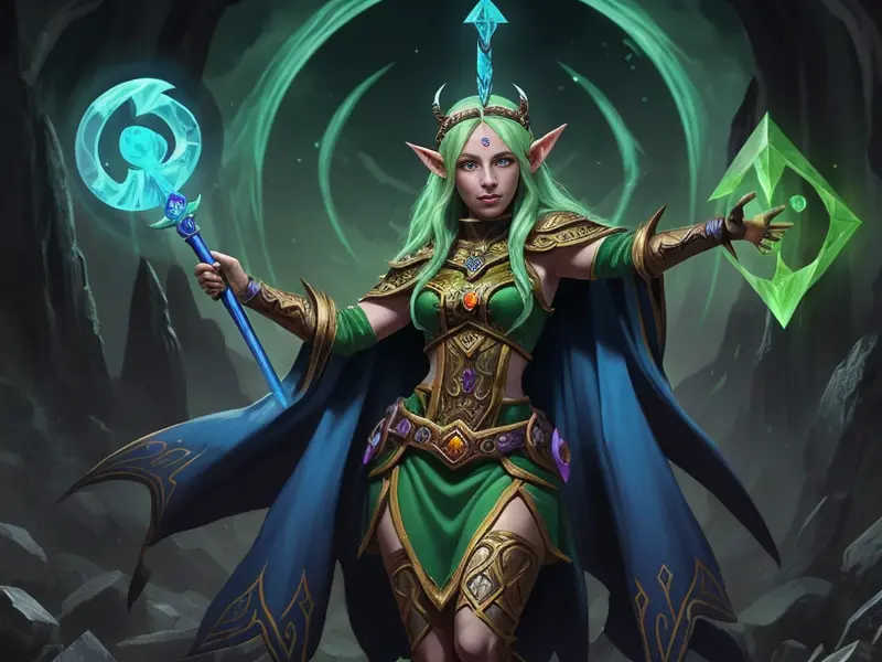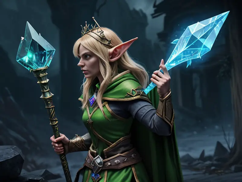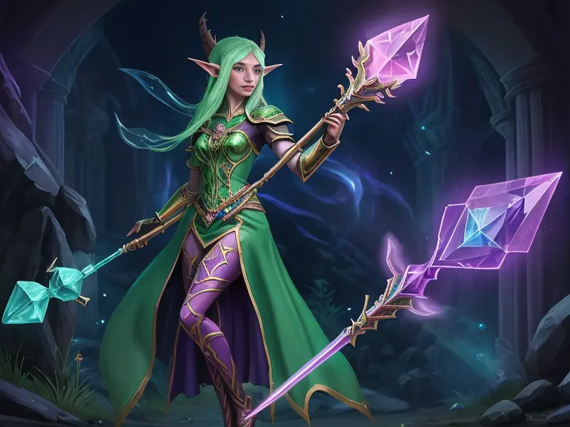 Illustration of Calculated Elf, Spellbreaker, Magical staff with glowing crystal, full-body shot, warcraft style, colorful and fun