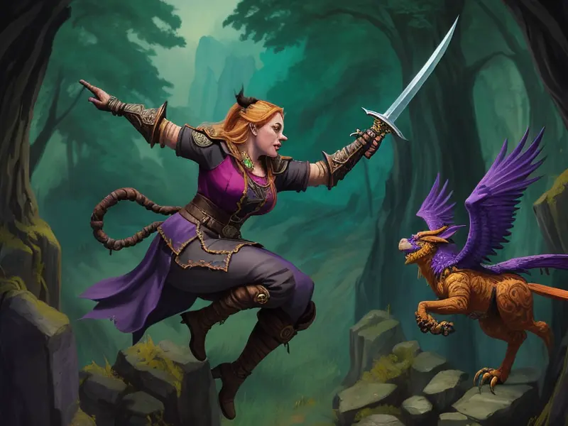 Illustration of Vindictive Dwarf, Witch, Leaping from gryphon, sword raised, profile shot, warcraft style, colorful and fun