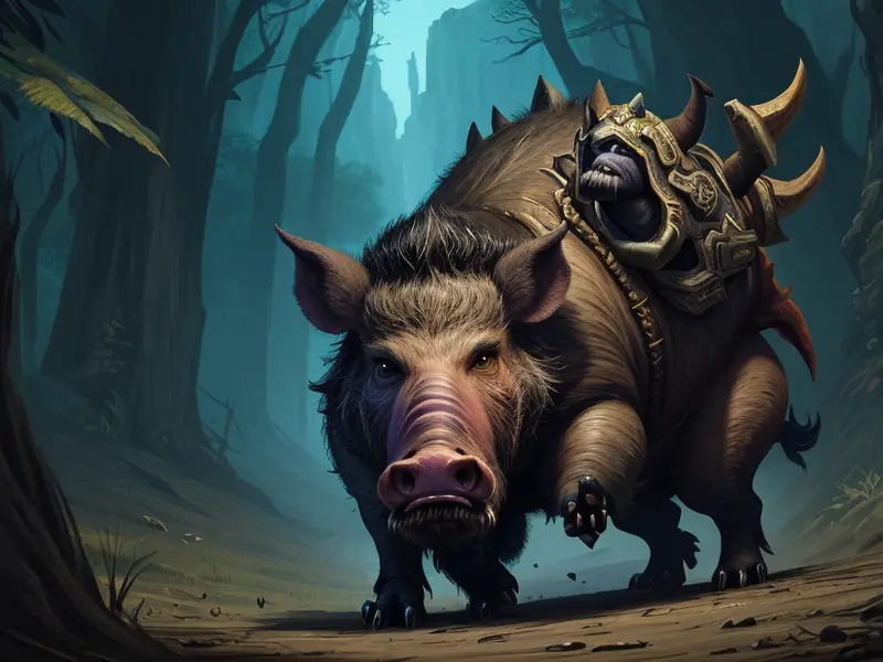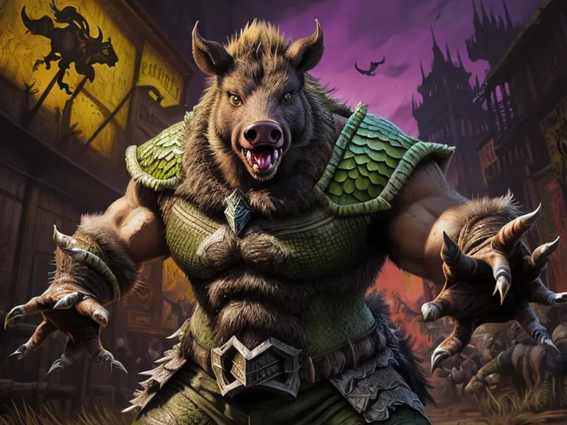 Illustration of Dream-walking Boar, Scar running across the right eye, waist-up shot, Weak, warcraft style, colorful and fun