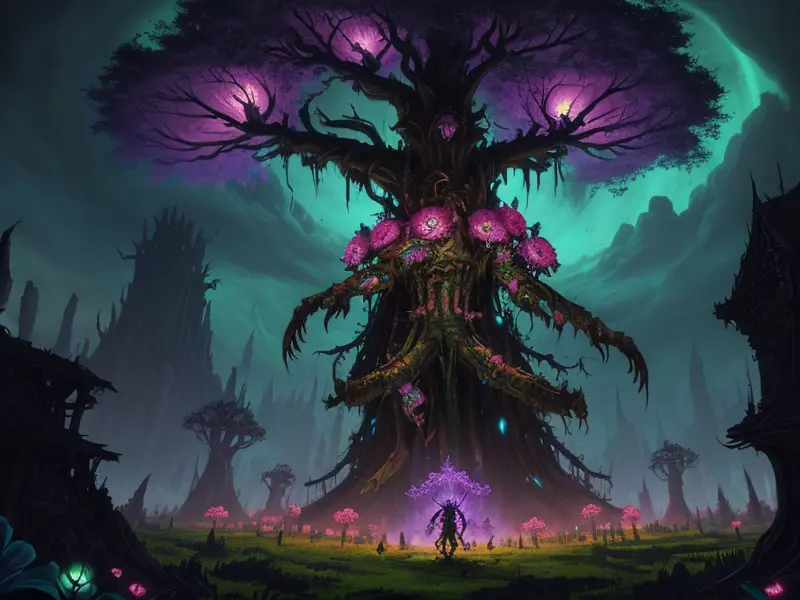 Illustration of Cursed Undead, Barbarian, Scaling colossal tree city with glowing flowers, full-body shot, warcraft style, colorful and fun