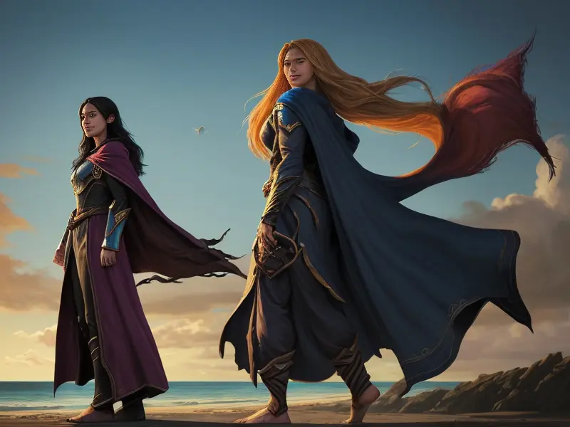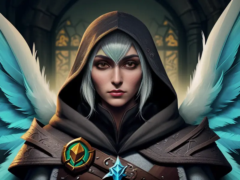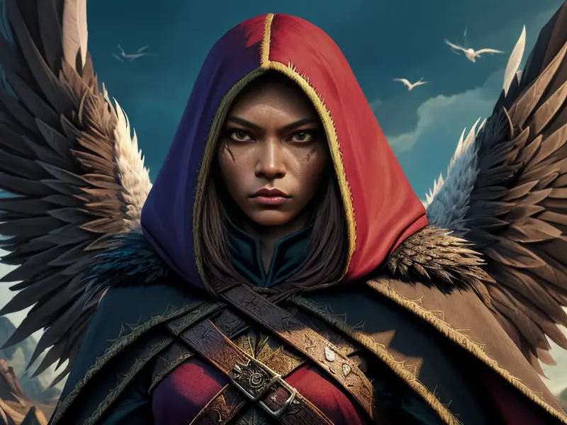 Illustration of Fierce Human, Assassin, Cloak made of feathers from mythical birds, medium shot, heroic fantasy human, realistic human face, natural skin tones, normal human anatomy, warcraft style, colorful and fun
