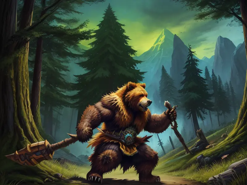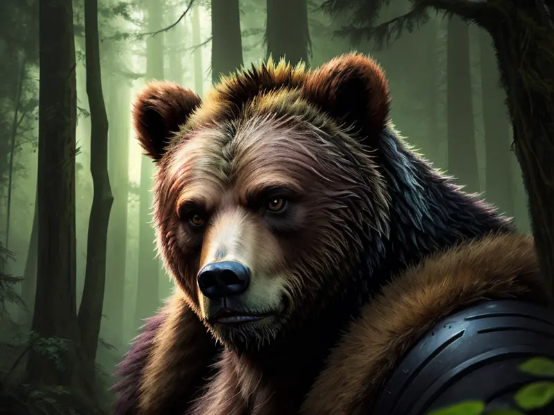 Illustration of Inquisitive Grizzly, In a misty forest, close-up portrait, Fragile, warcraft style, colorful and fun