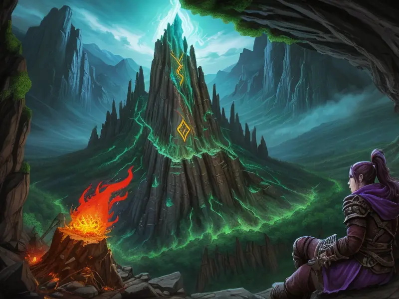 Illustration of Rune-marked Fire Elemental, Spellbreaker, Clinging to cliff vines, warcraft style, colorful and fun