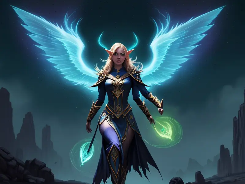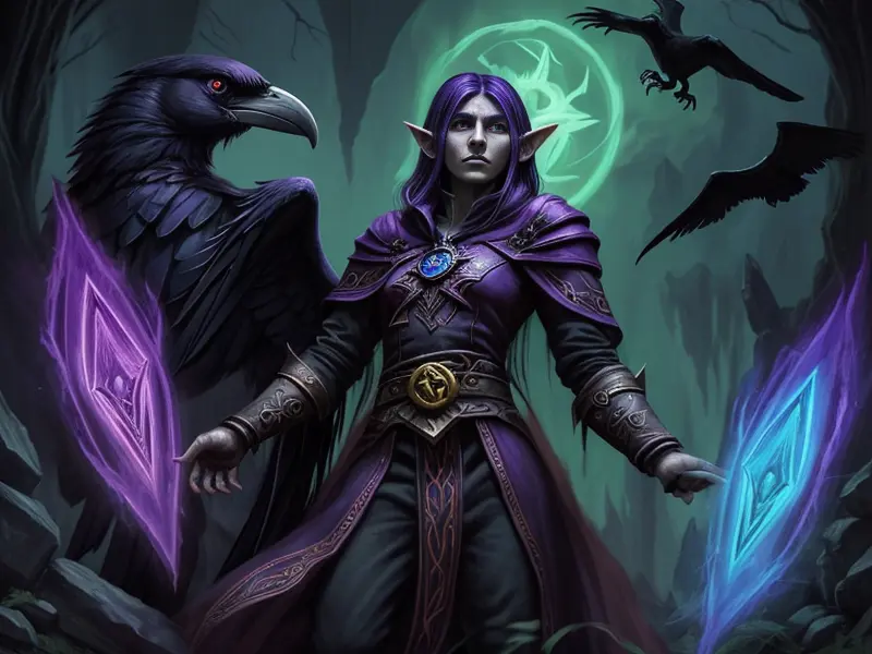 Illustration of Ashen Elf, Inquisitor, Cloak made of feathers from mythical birds, close-up portrait, warcraft style, colorful and fun
