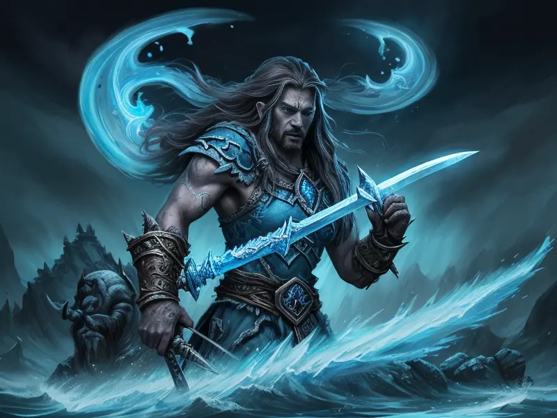 Illustration of Nightbound Water Elemental, Runemaster, Sword with ancient runes wielded, dynamic angle, Robust, warcraft style, colorful and fun