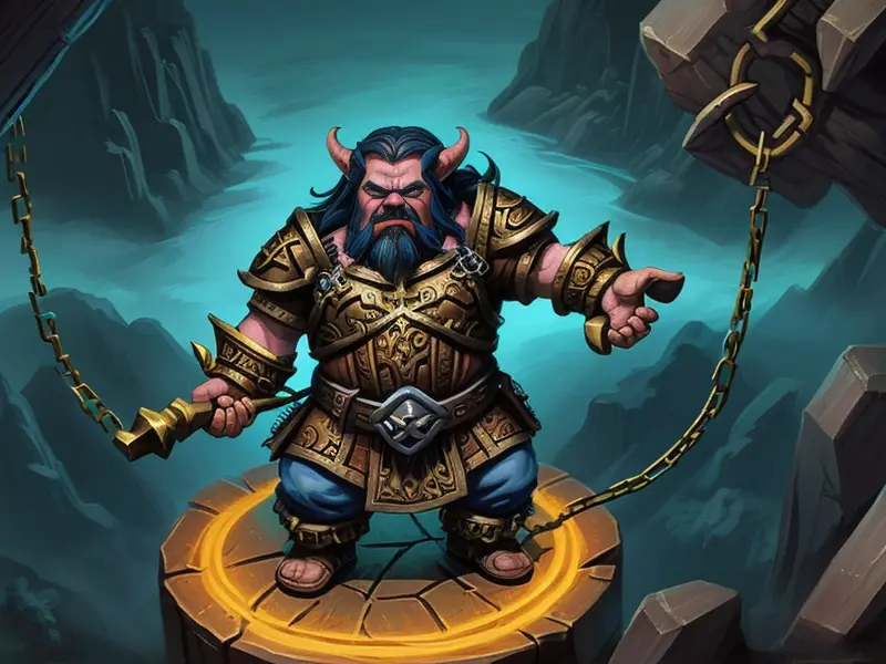 Illustration of Merciless Dwarf, Sentinel, Atop a gargantuan chain bridge, swaying over lava, warcraft style, colorful and fun