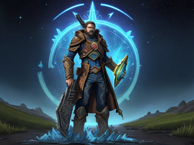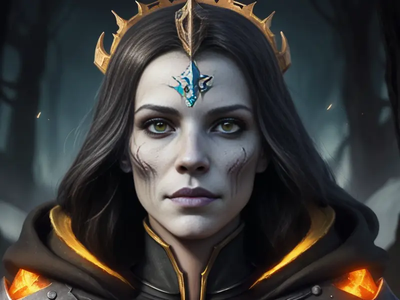 Illustration of Oathbound Human, Voidwalker, A ring of floating daggers ready to strike, extreme close-up, heroic fantasy human, realistic human face, natural skin tones, normal human anatomy, warcraft style, colorful and fun