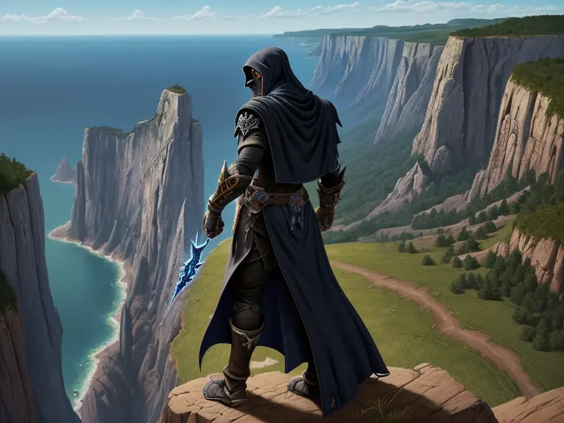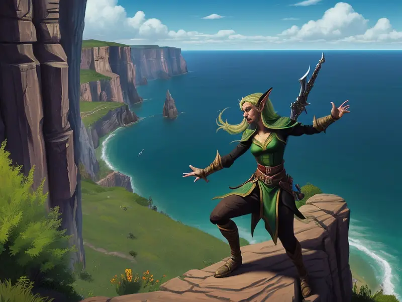 Illustration of Deceptive Elf, Assassin, At the edge of a cliff, arms outstretched to the horizon, Robust, warcraft style, colorful and fun