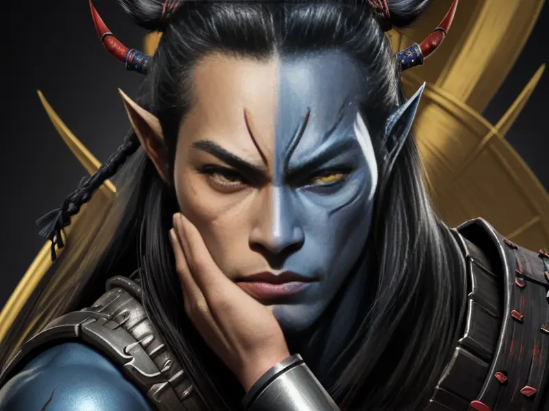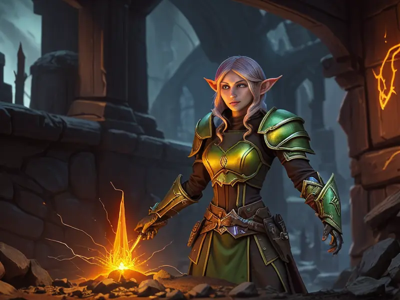 Illustration of Inquisitive Elf, Assassin, A molten core glowing through cracked armor, three-quarter view, Very Rare, warcraft style, colorful and fun