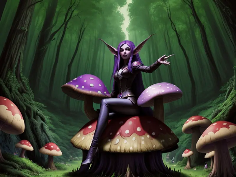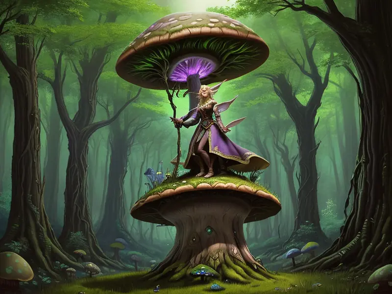Illustration of Inquisitive Elf, Spiritwalker, Atop a giant mushroom in a fairy forest, Epic, warcraft style, colorful and fun