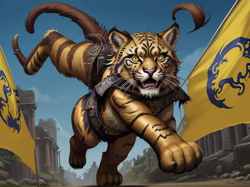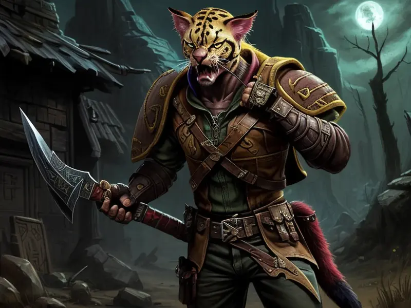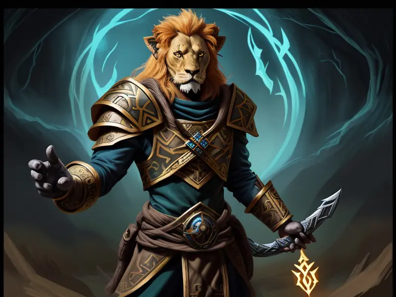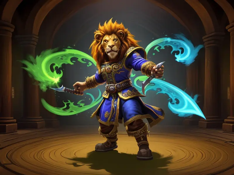 Illustration of Nimble Lion, Spinning daggers fluidly, wide angle shot, warcraft style, colorful and fun