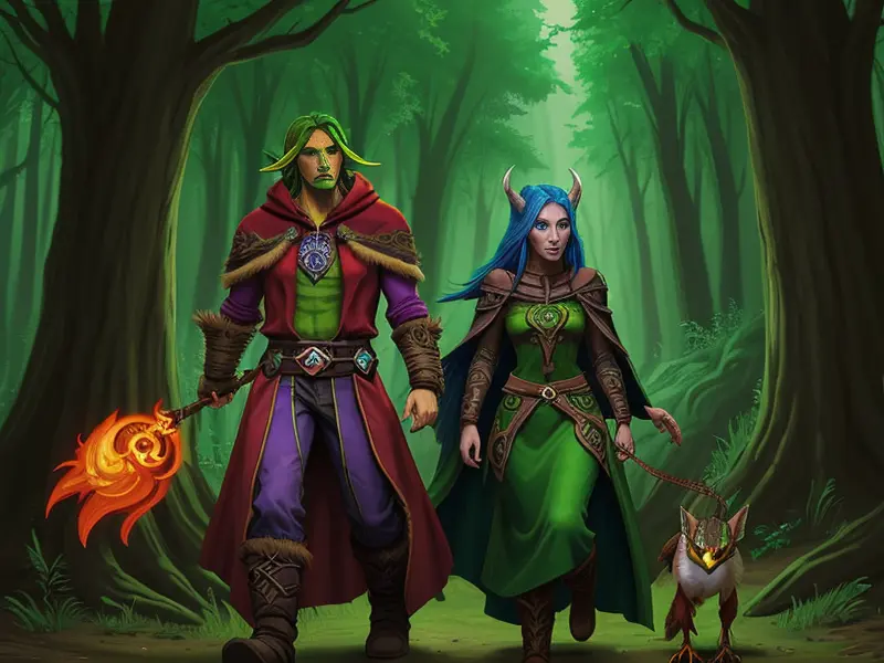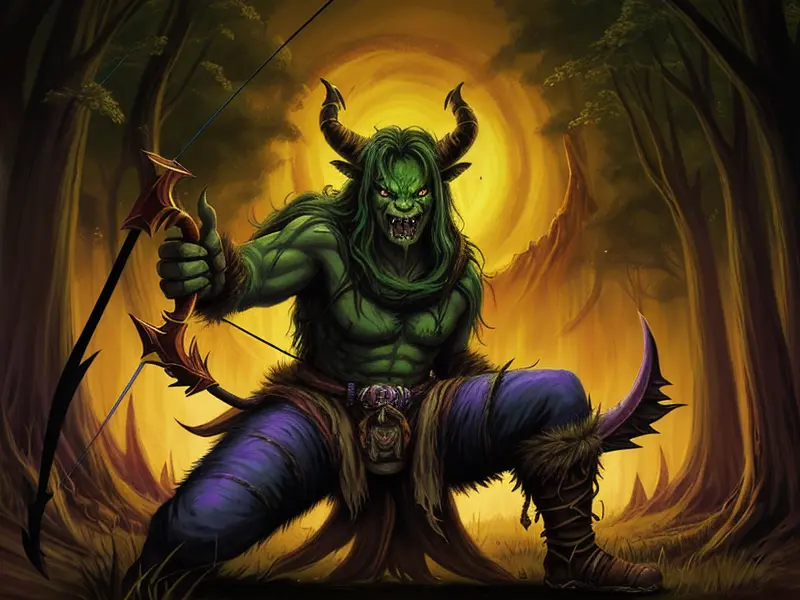 Illustration of Feral Demon, Druid, Pulling bowstring, arrow aimed, warcraft style, colorful and fun