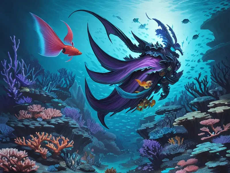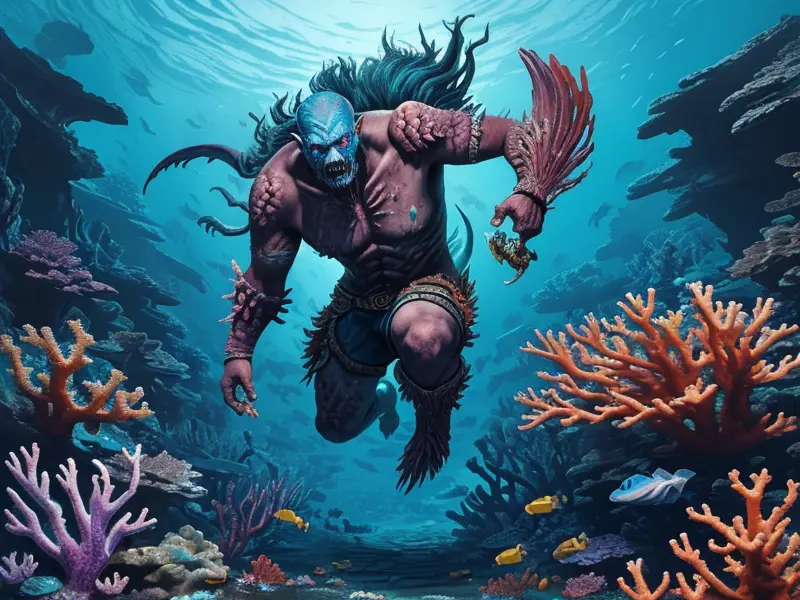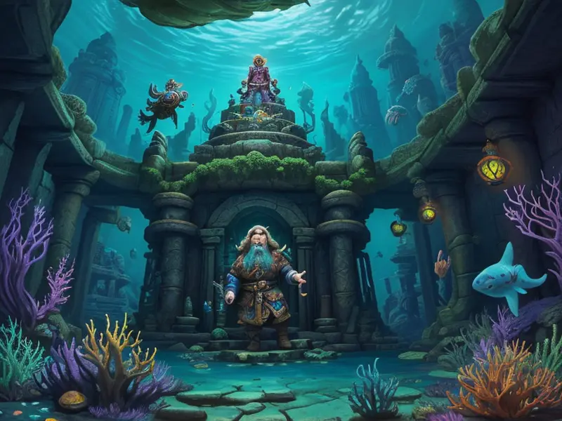 Illustration of Timeworn Dwarf, Sorcerer, In an underwater temple, surrounded by aquatic creatures, warcraft style, colorful and fun