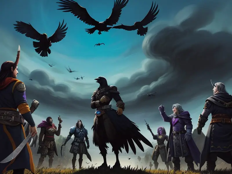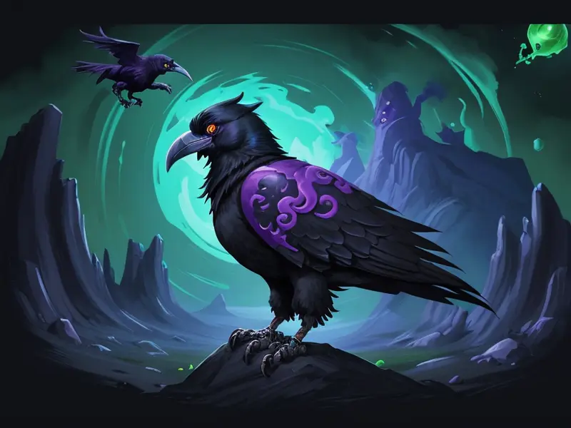 Illustration of Altruistic Roc, At the edge of a battlefield, crows circling overhead, warcraft style, colorful and fun