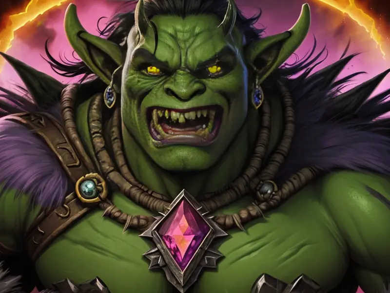 Illustration of Tenacious Orc, Chronomancer, A jagged cloak pin carved from dragon bone, warcraft style, colorful and fun