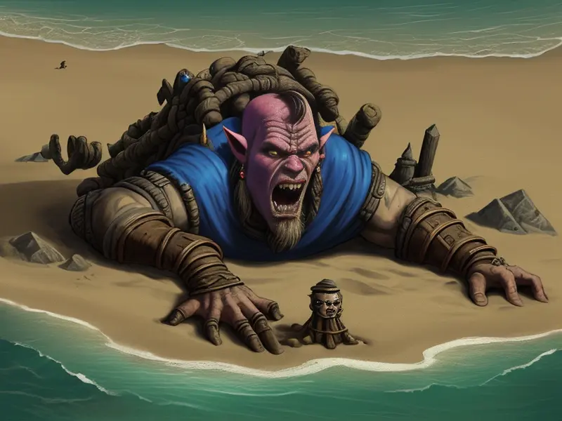 Illustration of Patient Earth Elemental, Monk, On a shipwreck half-buried in the sand, Powerful, Robust, warcraft style, colorful and fun