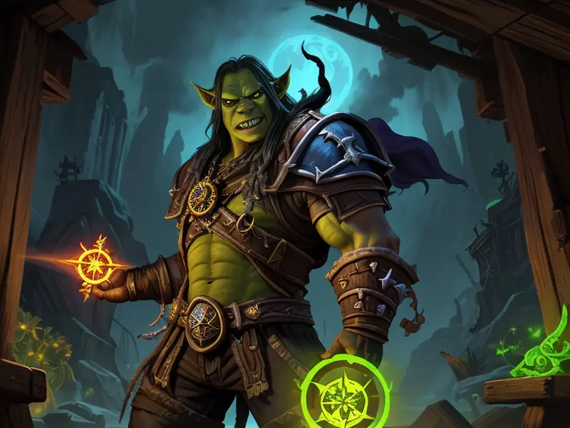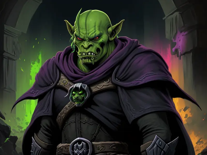 Illustration of Mischievous Orc, Sorcerer, Tattoo that glows when danger is near, Fragile, warcraft style, colorful and fun
