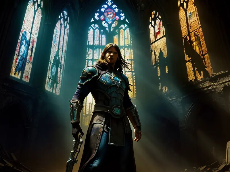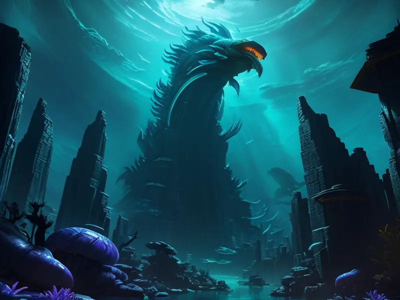 Illustration of Savage Dwarf, Hexblade, Facing leviathan in sunken cathedral, Robust, warcraft style, colorful and fun