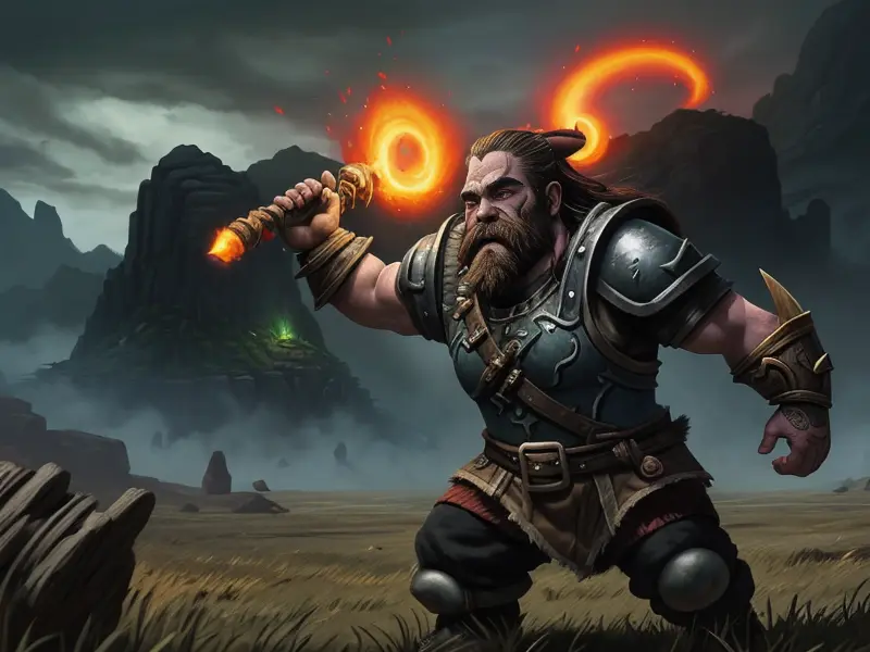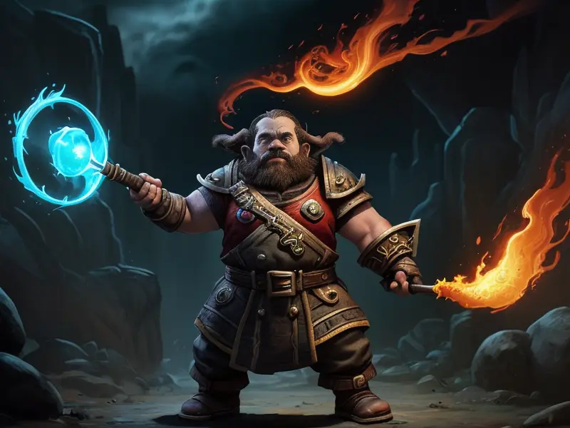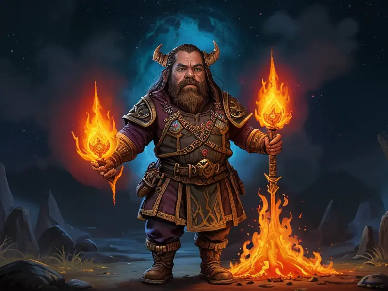 Illustration of Flame-touched Dwarf, Stormcaller, Glowing frying pan with arcane energy, wide angle shot, Very Rare, Powerful, Robust, warcraft style, colorful and fun