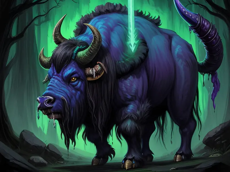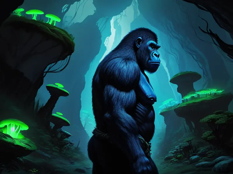 Illustration of Soulscarred Gorilla, In a canyon filled with bioluminescent fungi, profile shot, warcraft style, colorful and fun
