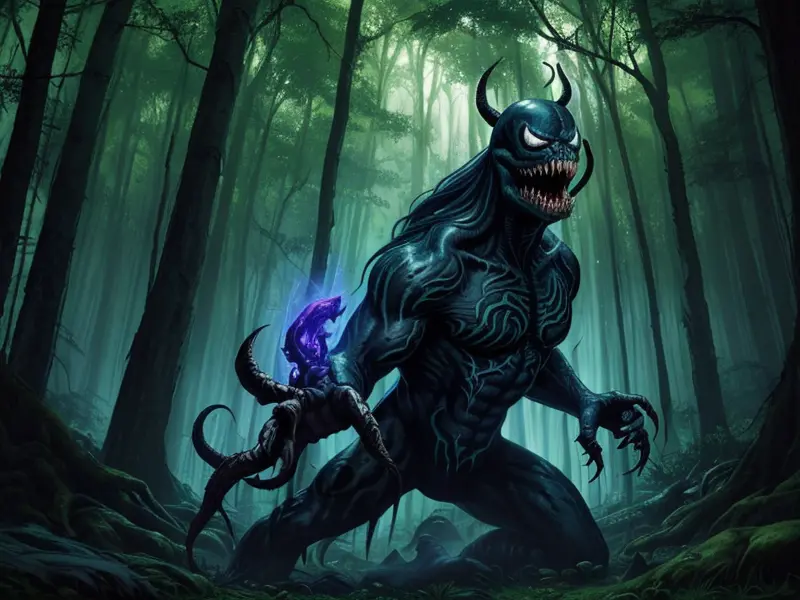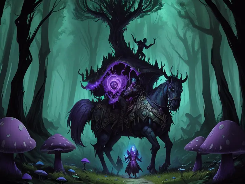 Illustration of Venom-marked Undead, Stormcaller, In a dense forest, surrounded by mystical creatures, wide angle shot, warcraft style, colorful and fun