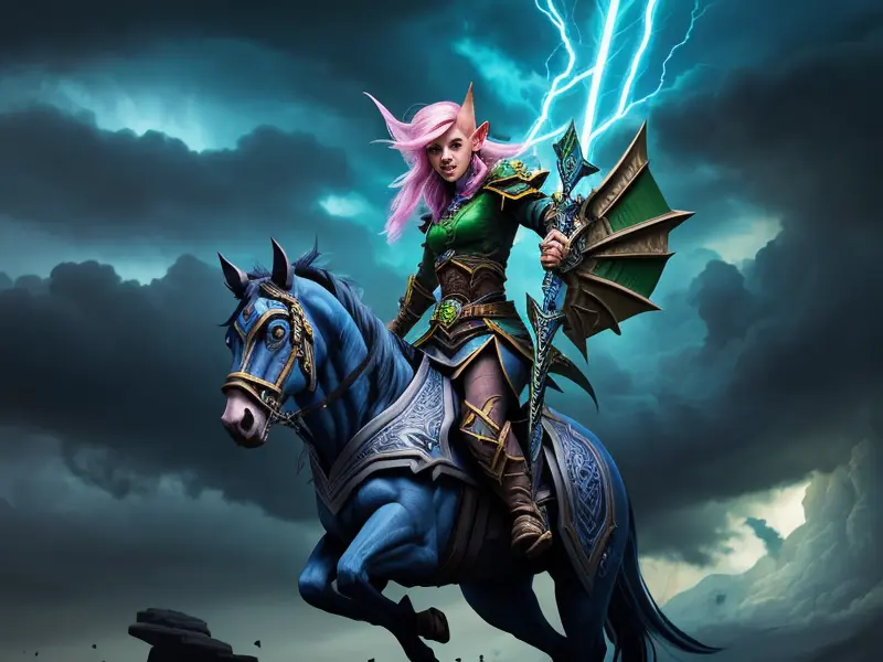 Illustration of Deceptive Dwarf, Artificer, Riding storm cloud crackling with thunder, Very Rare, warcraft style, colorful and fun
