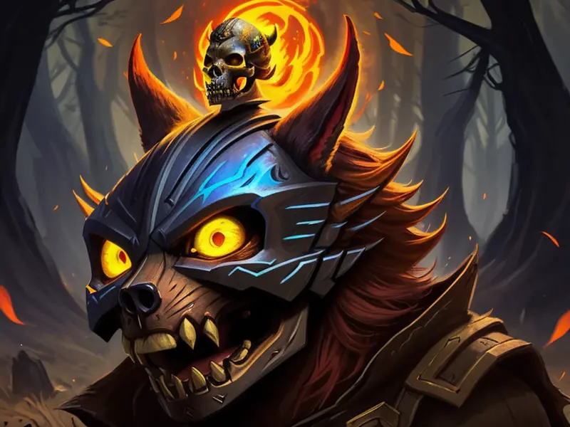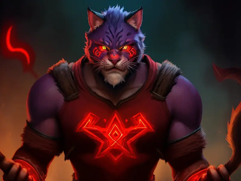 Illustration of Emberborn Wildcat, Wears a skull-shaped helmet, warcraft style, colorful and fun