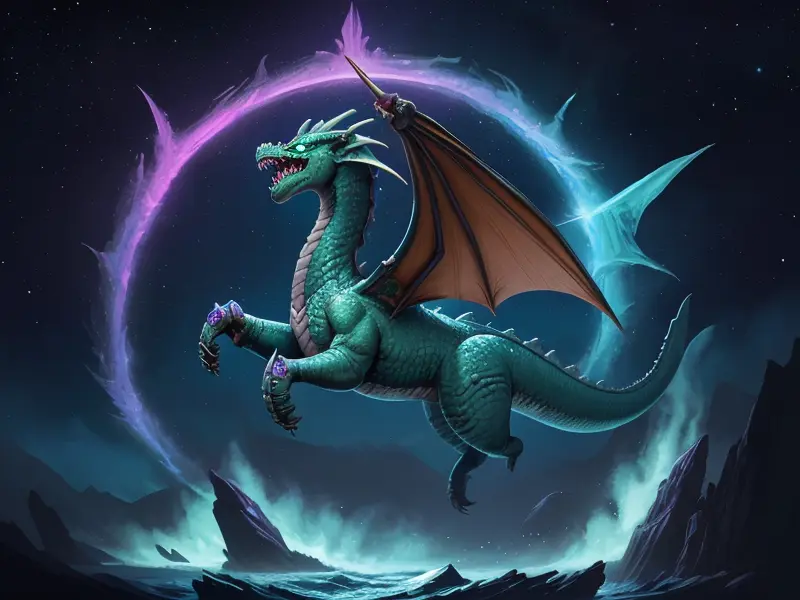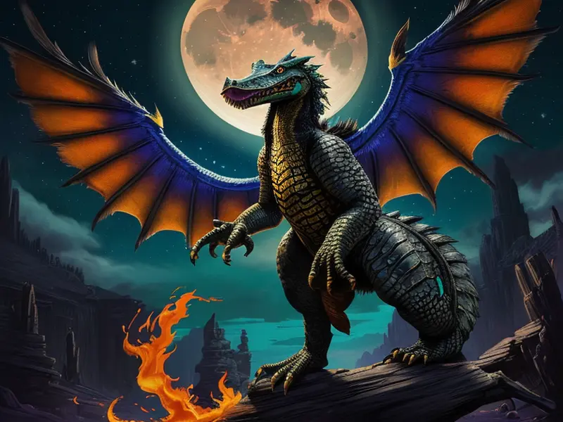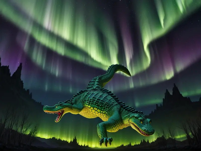 Illustration of Nimble Alligator, Under a sky lit by shimmering auroras, shoulder-level shot, warcraft style, colorful and fun