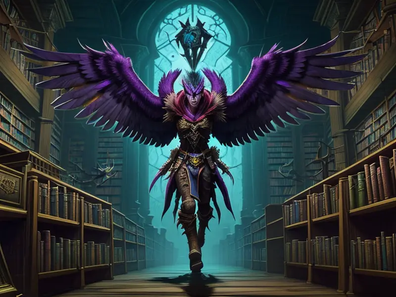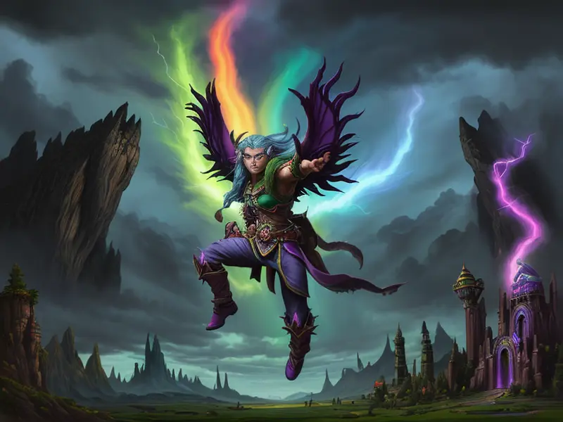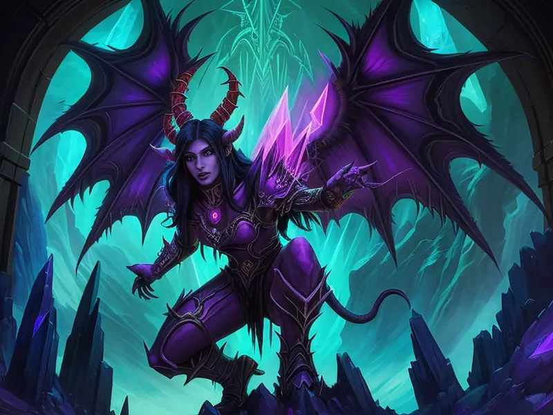 Illustration of Altruistic Demon, Oracle, Soaring between crystal spires, low angle shot, Very Rare, warcraft style, colorful and fun