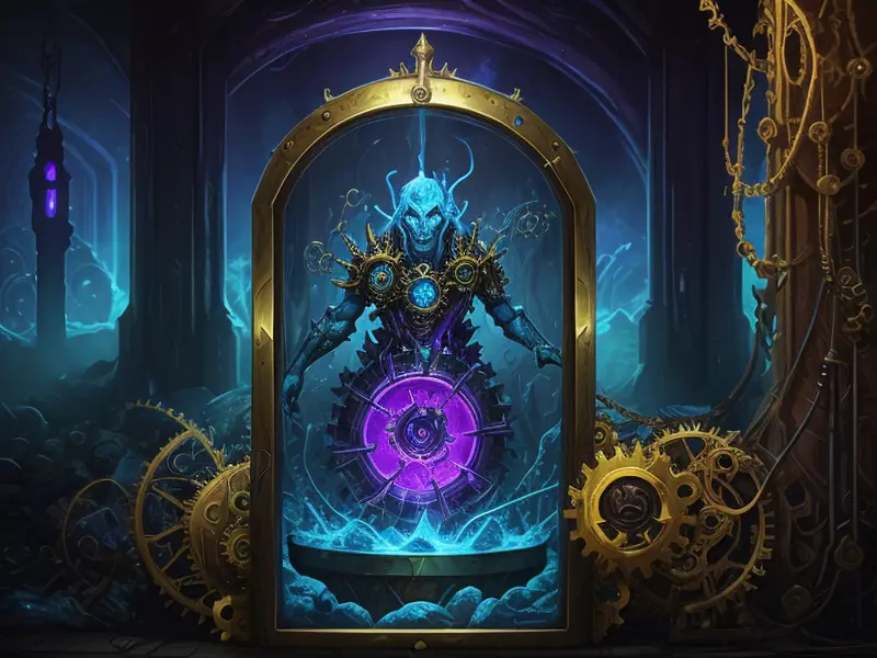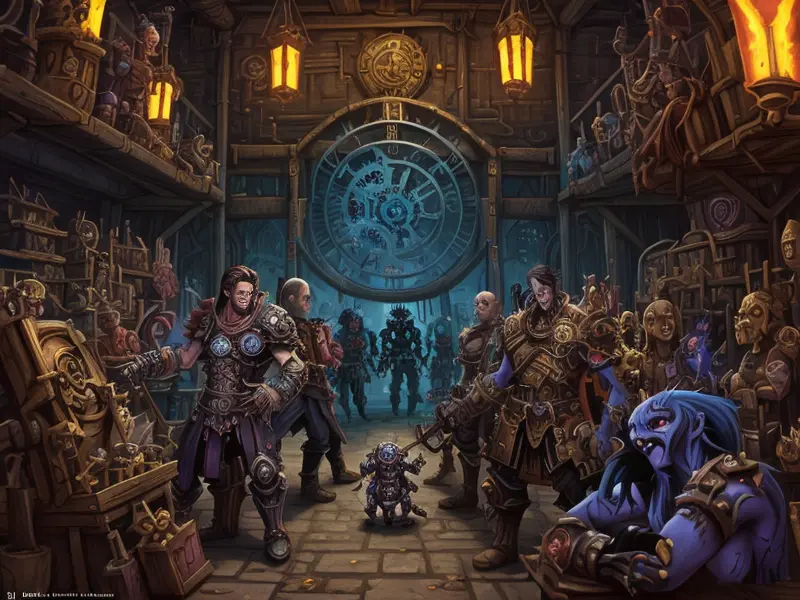 Illustration of Determined Undead, Gladiator, Inside a clockwork workshop, gears ticking in unison, warcraft style, colorful and fun