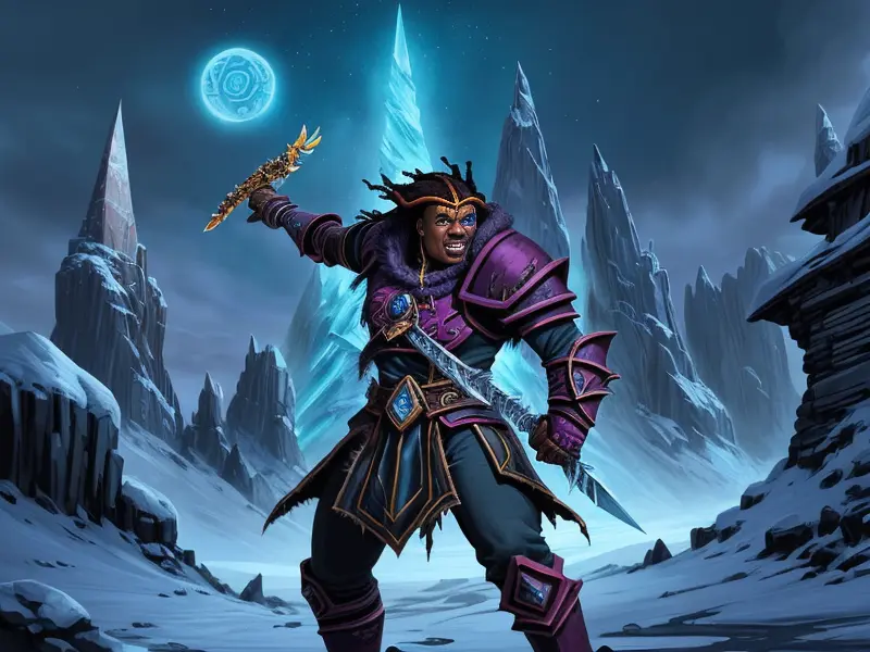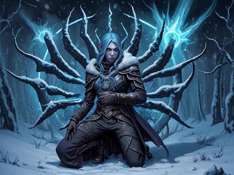 Illustration of Soulscarred Dwarf, Duelist, Hurling frost spears atop icy spire, warcraft style, colorful and fun