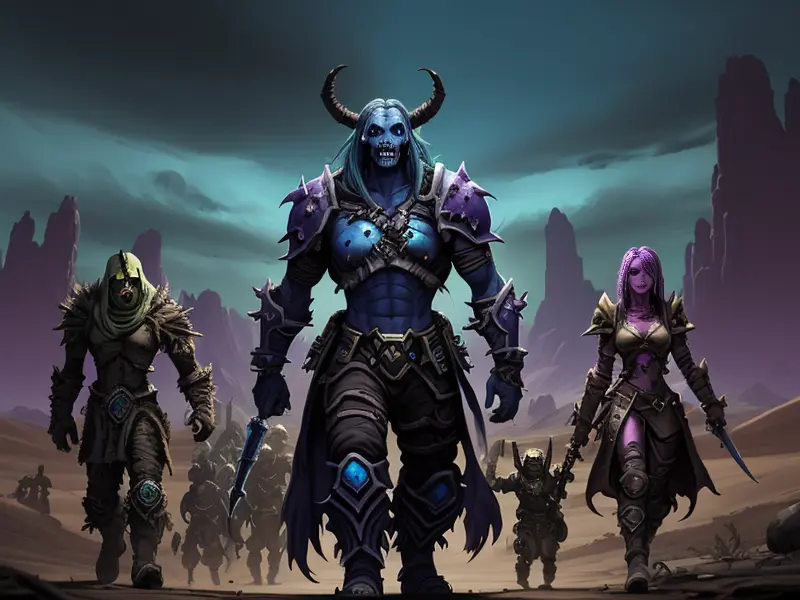 Illustration of Battle-hardened Undead, Psion, Wandering bone-littered desert, Robust, warcraft style, colorful and fun