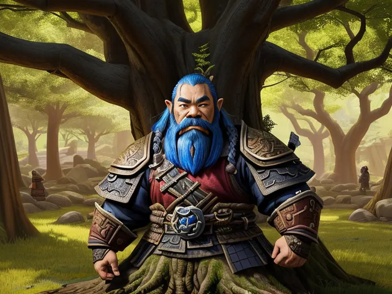 Illustration of Starforged Dwarf, Samurai, Under an ancient tree, studying engravings on its bark, Weak, warcraft style, colorful and fun