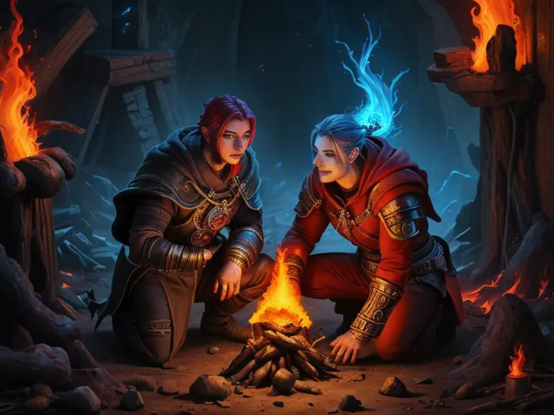 Illustration of Arcane Fire Elemental, Artificer, Kneeling beside a dying ember, whispering an oath, high angle shot, Robust, warcraft style, colorful and fun