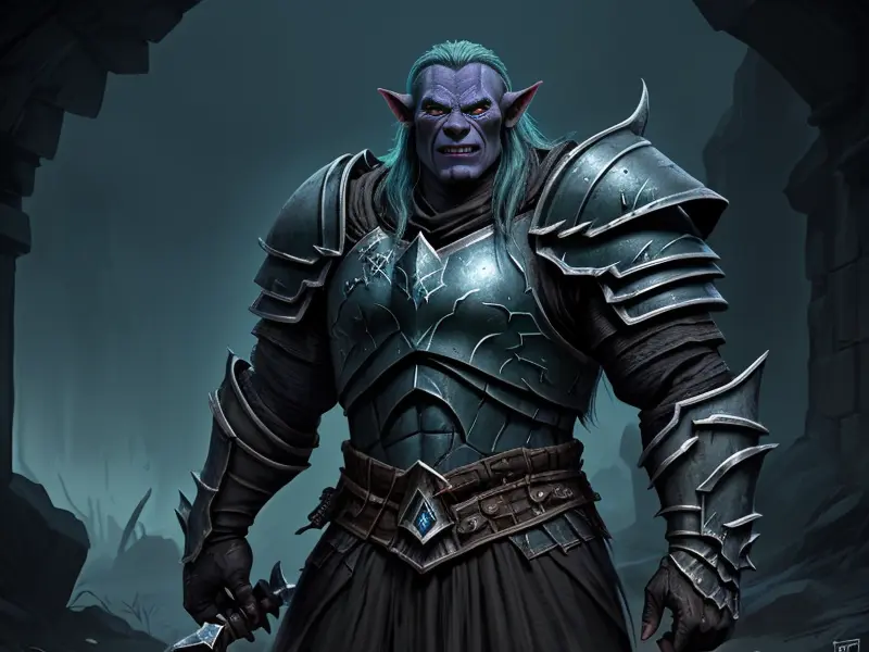 Illustration of Ashen Orc, Warden, Armor as dark as night, Powerful, Robust, warcraft style, colorful and fun