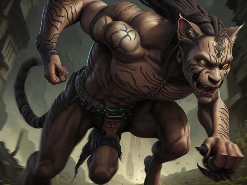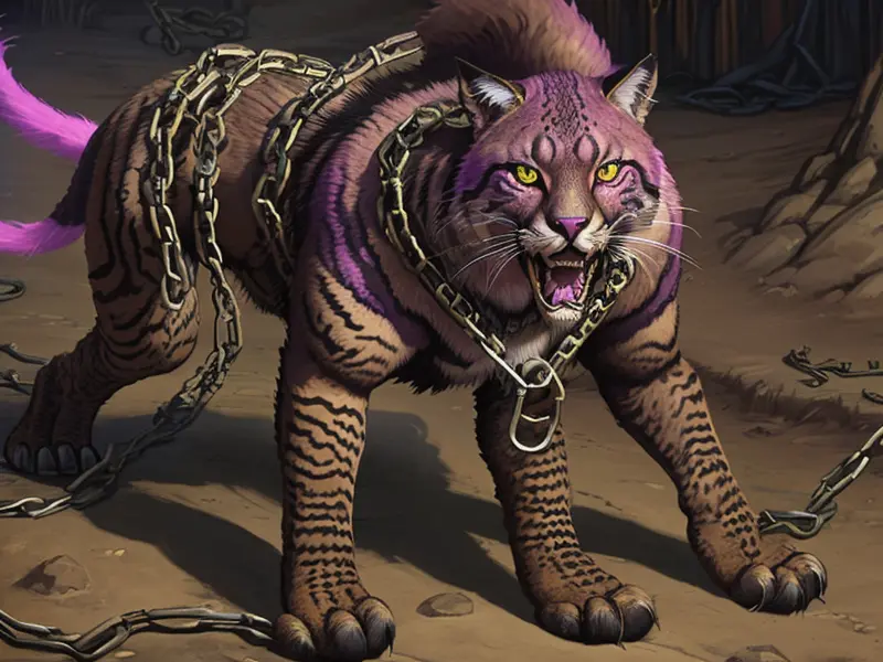 Illustration of Feral Puma, Left arm wrapped in chains, high angle shot, Weak, warcraft style, colorful and fun
