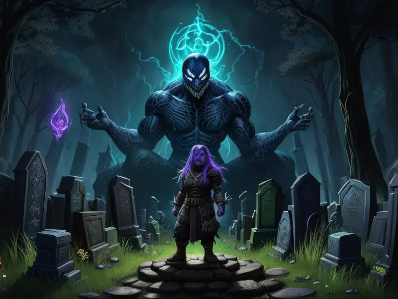 Illustration of Venom-marked Dwarf, Alchemist, In a graveyard, surrounded by shimmering spirits, Epic, warcraft style, colorful and fun