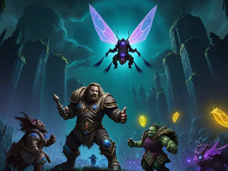 Illustration of Bonecarved Dwarf, Gladiator, A swarm of luminous moths circling them, Epic, warcraft style, colorful and fun