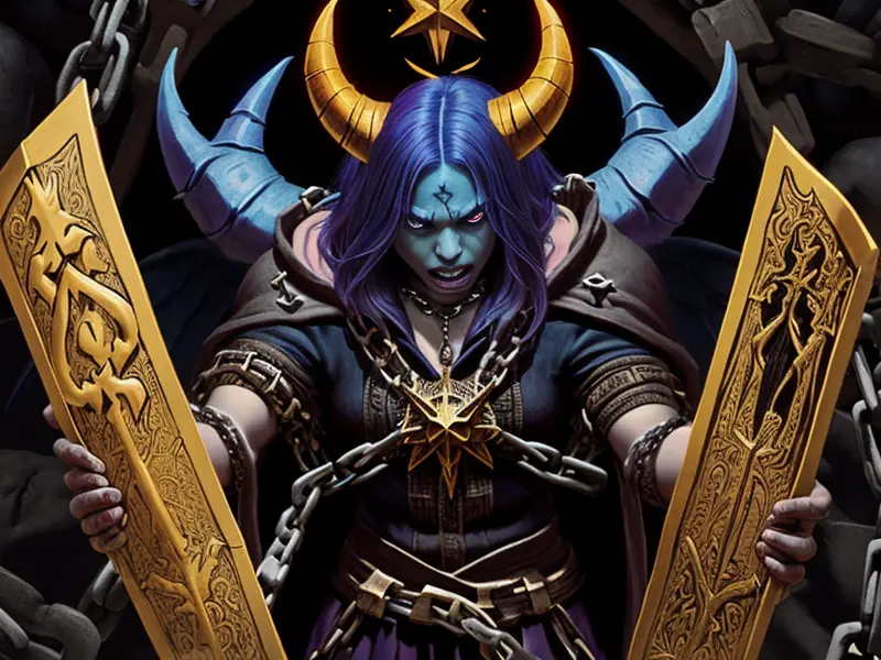 Illustration of Star-touched Demon, Occultist, Holds a cursed scroll bound in chains, high angle shot, Epic, warcraft style, colorful and fun