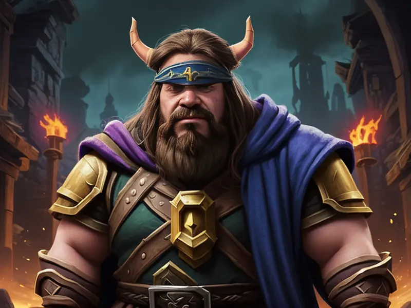Illustration of Heroic Dwarf, Paladin, Wears a blindfold but sees everything, shoulder-level shot, Epic, warcraft style, colorful and fun