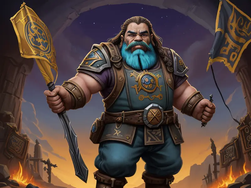 Illustration of Steel-minded Dwarf, Artificer, Carries a banner marked with ancient sigils, full-body shot, Very Rare, warcraft style, colorful and fun