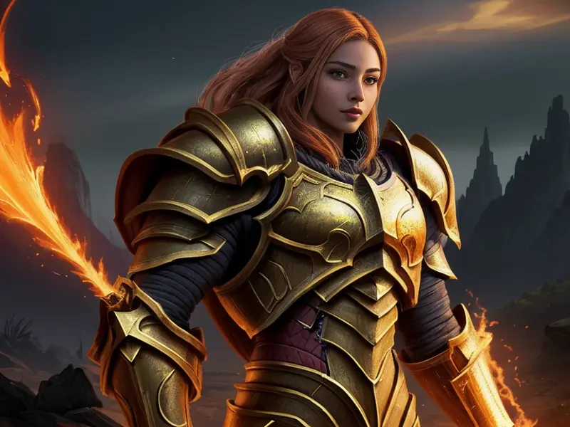 Illustration of Optimistic Human, Knight, Armor of glowing embers, full-body shot, heroic fantasy human, realistic human face, natural skin tones, normal human anatomy, warcraft style, colorful and fun