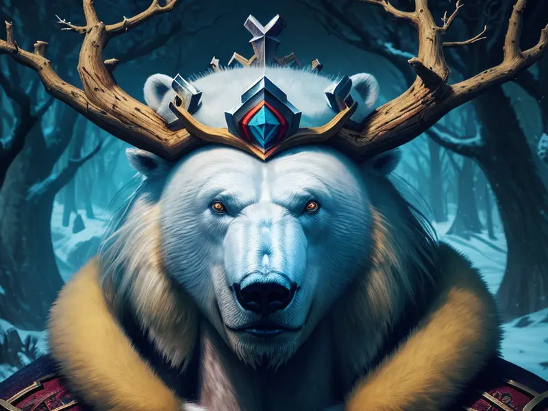 Illustration of Generous Polar Bear, Crown made of twisted branches, close-up portrait, Epic, warcraft style, colorful and fun