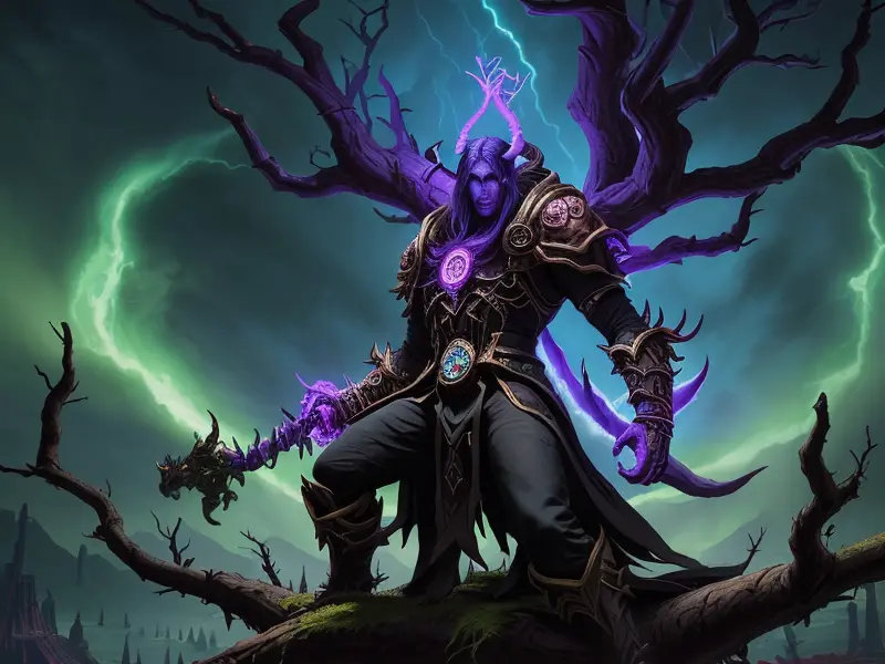Illustration of Bonecarved Demon, Chronomancer, Atop a massive tree with branches touching the sky, knee-up shot, Epic, warcraft style, colorful and fun