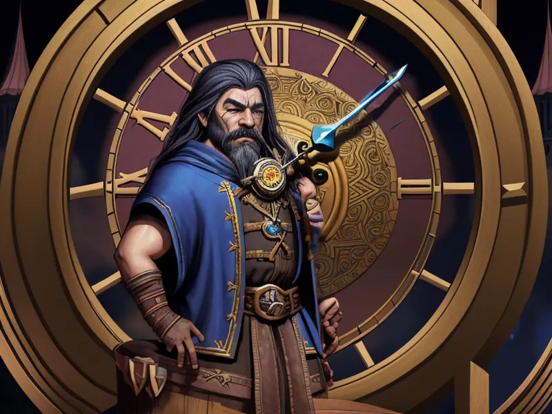 Illustration of Honorable Dwarf, Chronomancer, Atop a clocktower, listening to its rhythmic ticking, shoulder-level shot, Very Rare, warcraft style, colorful and fun